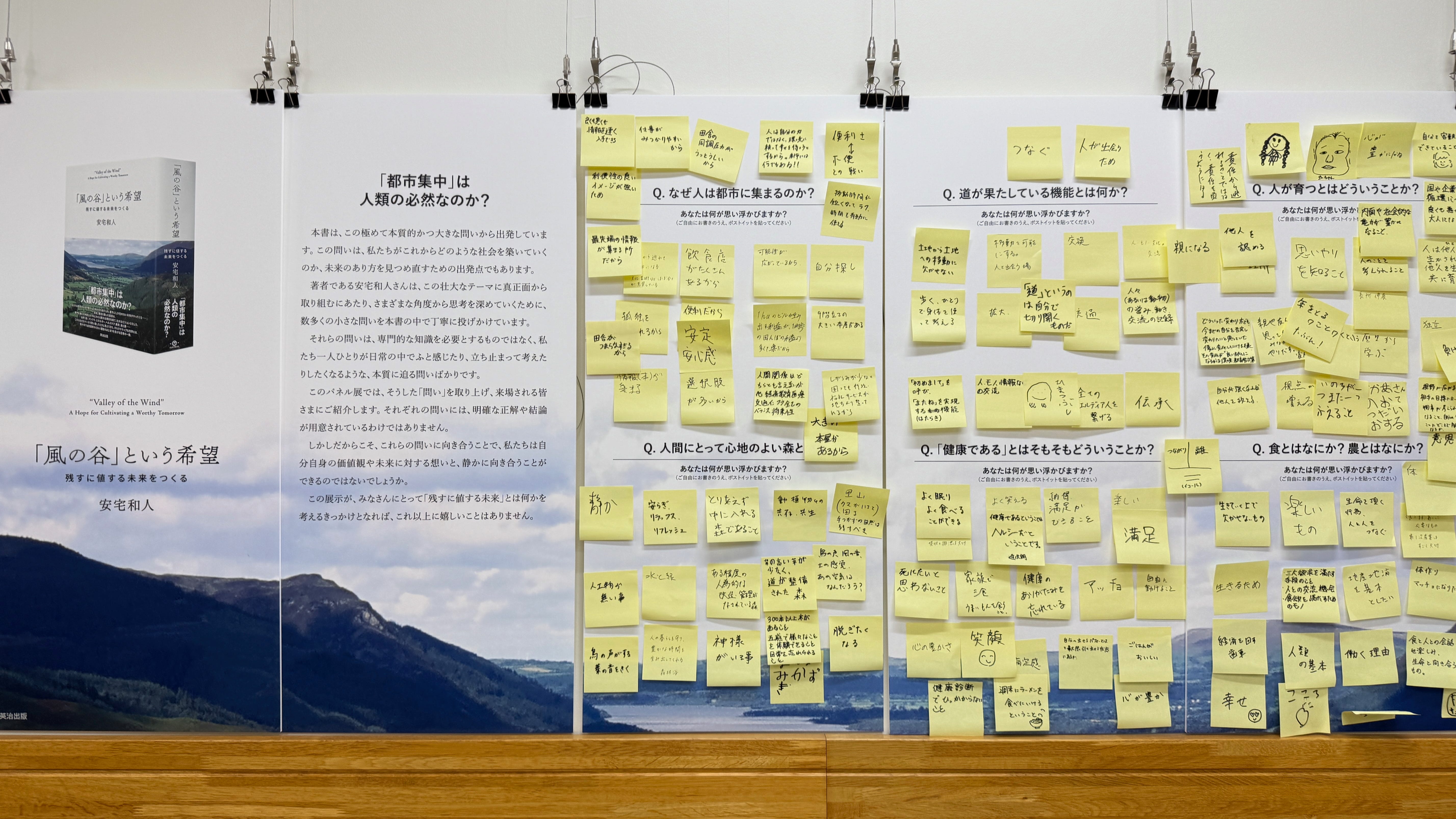 印象最深刻的是家裡附近的書店,直接策了迷你展,一大塊空間展示相關書籍(許多都是晦澀難懂的專門書),也有一張板子邀請大家一起討論「為什麼人會集中在都市?」、「道路的功能是什麼?」、「怎樣的狀態可以被稱為健康?」