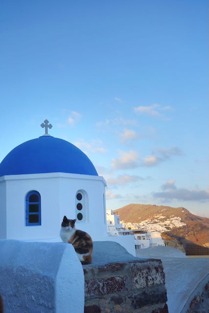 例如在聖托里尼,愛琴海上最著名的小島,跟著所有旅客在狹窄的樓梯上排隊,只為了在懸崖處拍一個「只有我的藍白小屋美景」的瞬間;吃到看了無數篇遊記提到期待已久的美食,味道跟我想像的一樣的瞬間;在拍照打卡完之後,跟旅伴各自面對桌子滑手機的瞬間。