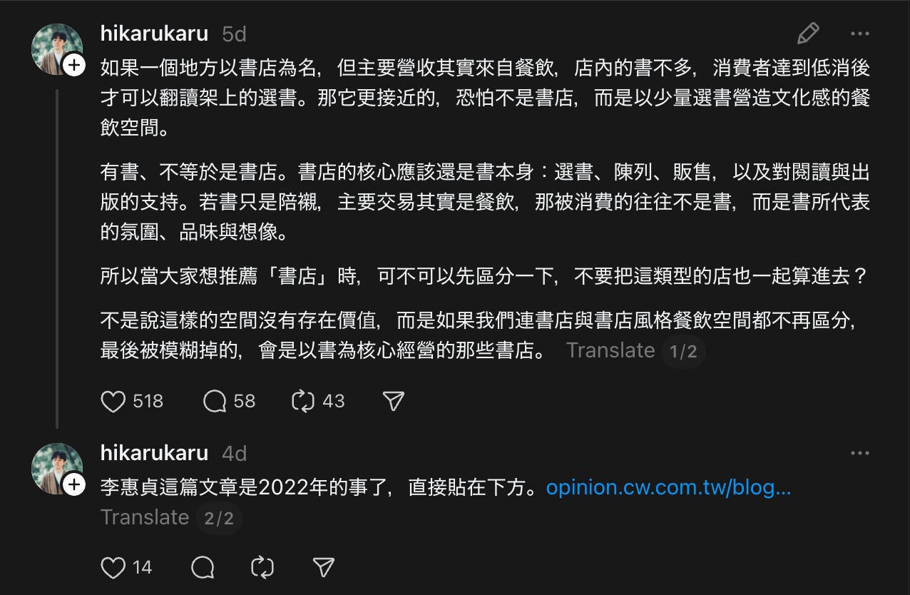 至於為什麼會想要在這個時間點談論書店這個話題,是剛好看到李屏瑤關於書店的看法,以及由此延伸的討論。