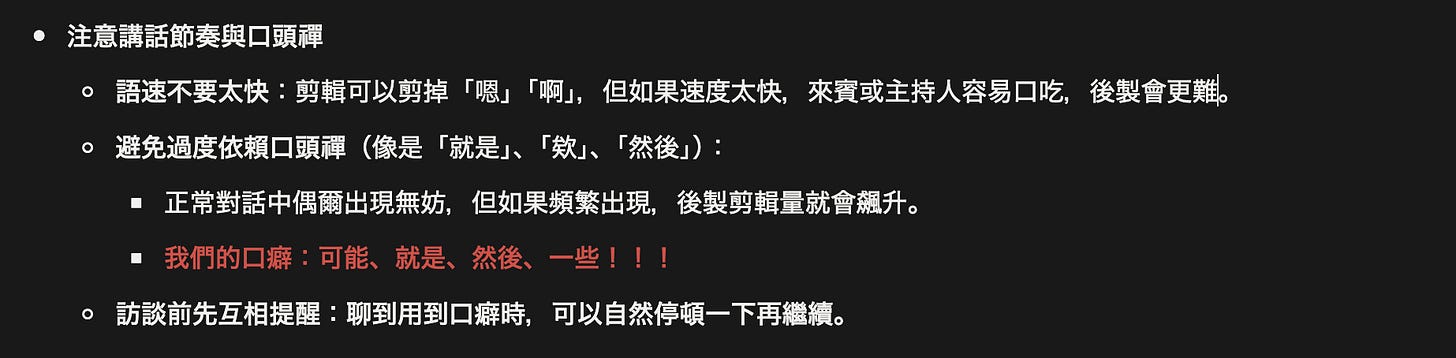 Podcast 錄到現在將近二十集,從第一集開始我和同伴就意識到我們兩個說話都有很多口癖。在講話當下覺得是很正常流暢的對話,但是剪輯環節就會非常地獄。為此我們還把自己的口癖記錄下來互相提醒: